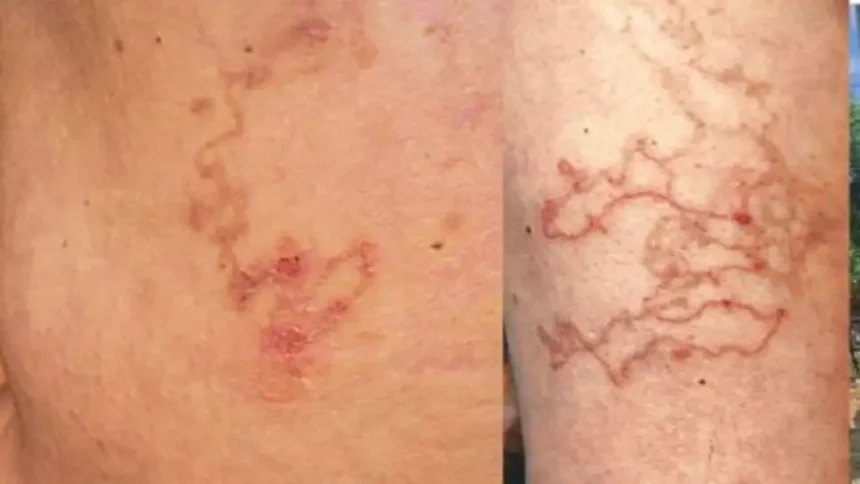 त्वचा पर लाल, टेढ़ी-मेढ़ी लकीरनुमा चकत्ते