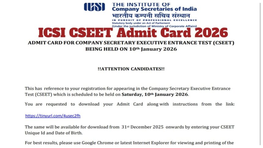 ICSI CSEET एडमिट कार्ड 2026 – icsi.edu से हॉल टिकट डाउनलोड करें; परीक्षा 10 जनवरी को होगी।